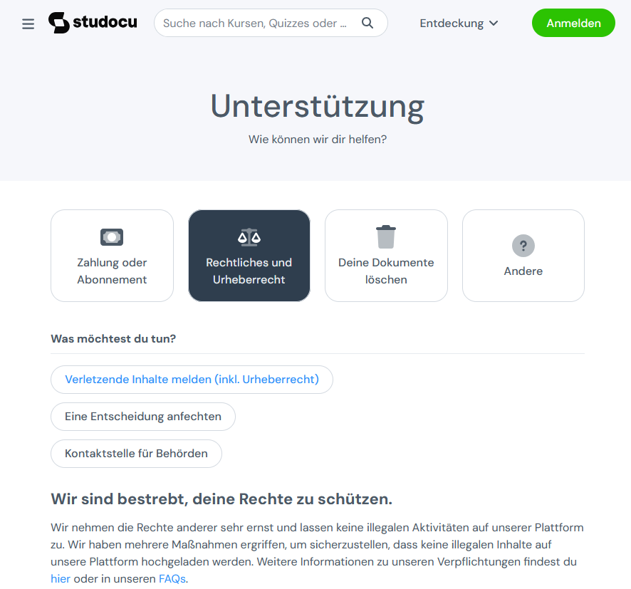 - Gehen Sie zu https://www.studocu.com/de/support, wählen Sie „Rechtliches und Urheberrecht“ und „Verletzende Inhalte melden“.